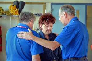 During their two-month deployment in Fort McMurray after the 2016 wildfire, Rapid Response Team chaplains were blessed to pray with Dana Allen (centre), Fort McMurray’s assistant deputy chief of operations.