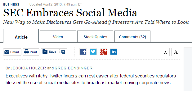For the most recent SEC commentary on social media, see their April 2 and March 15, 2013 releases at: